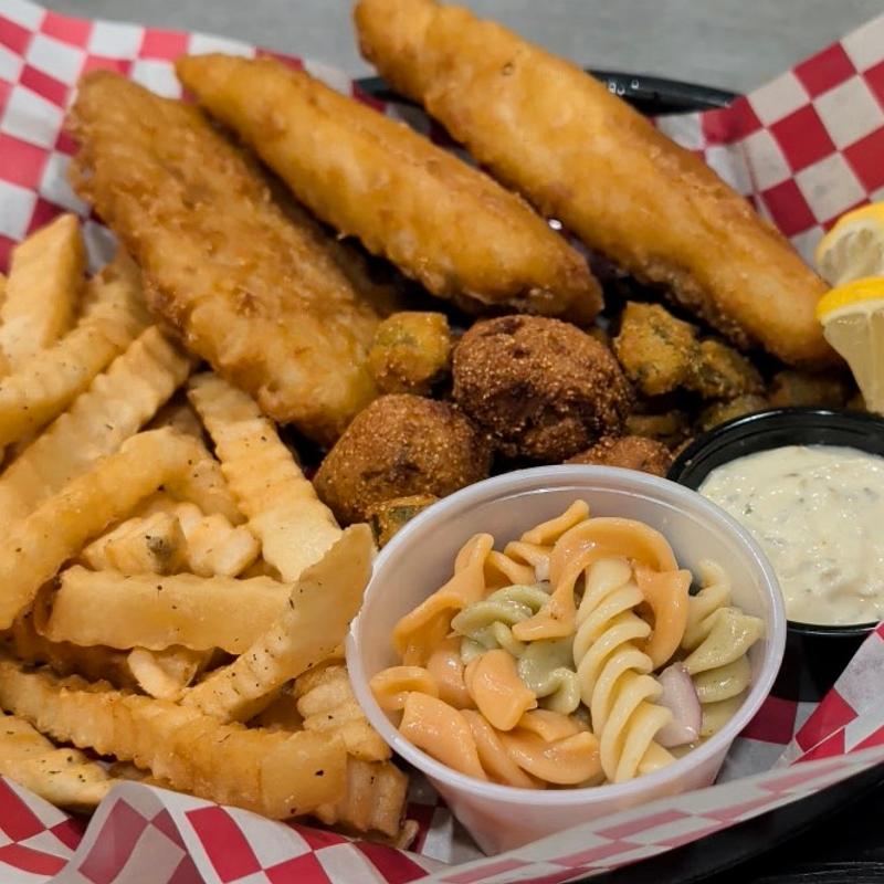 All baskets are served with a side of pasta salad and a choice of French fries, waffle fries, tater tots, homemade crispy onion rings, sweet potato fries, or Lays chips with fry sauce