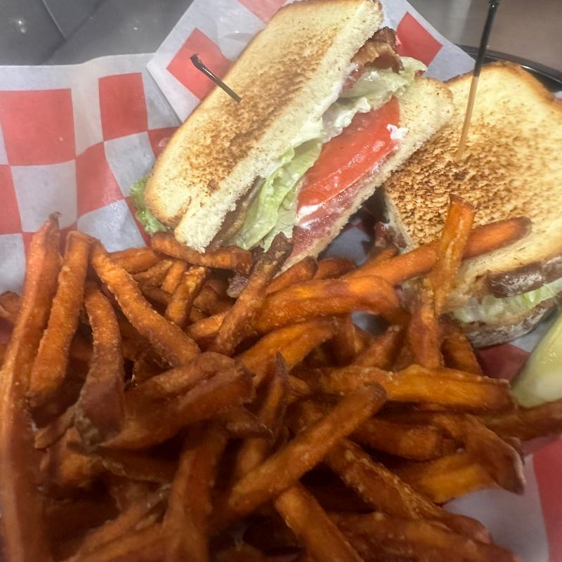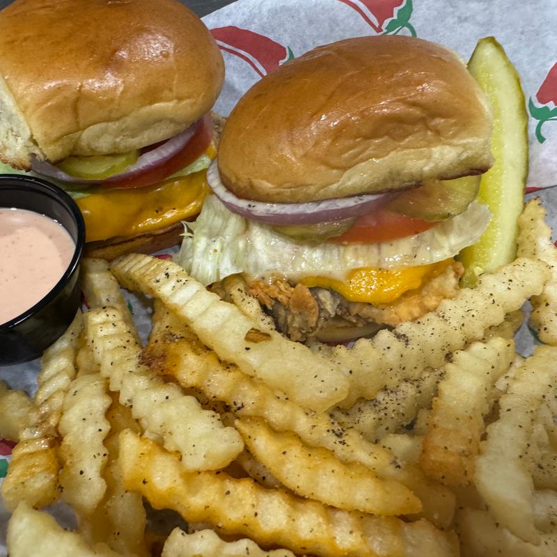 Served with a drink and choice of French fries, homemade crispy onion rings, tater tots, waffle fries, or sweet potato fries with fry sauce