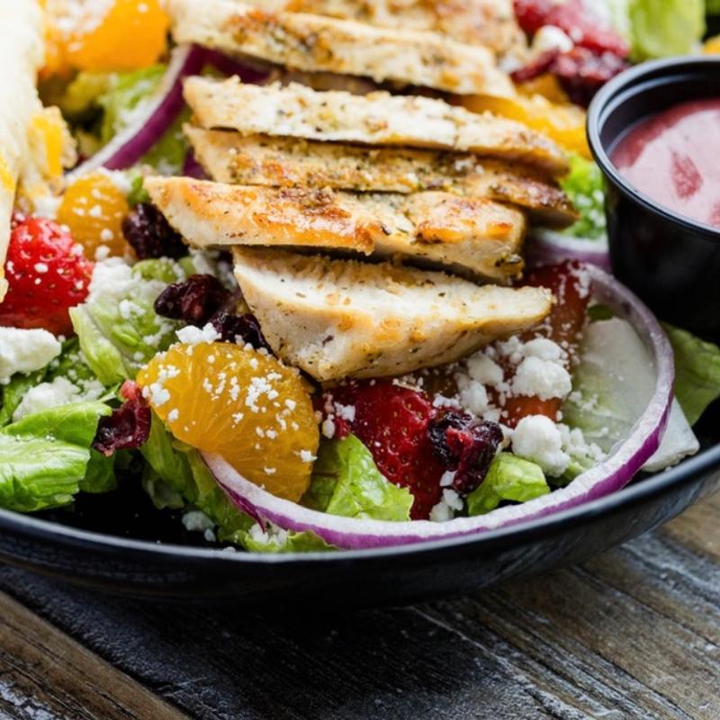 Grilled chicken breast on a bed of fresh lettuce. Served with red onion, feta cheese, strawberries, mandarin oranges, dried cranberries, honey roasted pecans, and white shallot balsamic vinaigrette