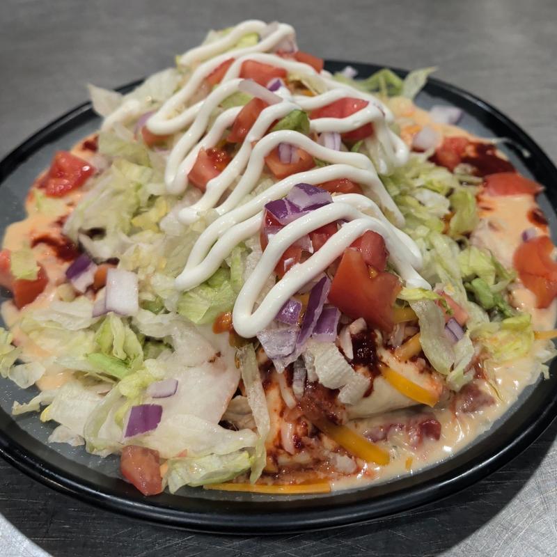 Served with ground beef, grilled onion, jalapeño, potato, and red chile. Smothered with queso, red chile, lettuce, tomato, onion, and sour cream