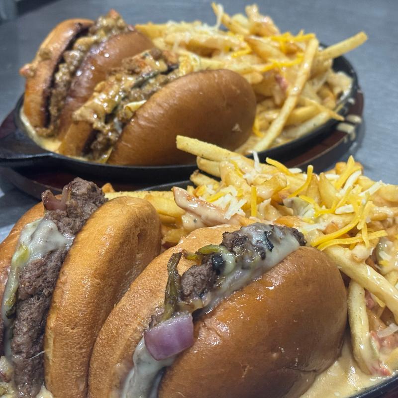 Ask for any burger in a cheesy skillet loaded with our homemade queso